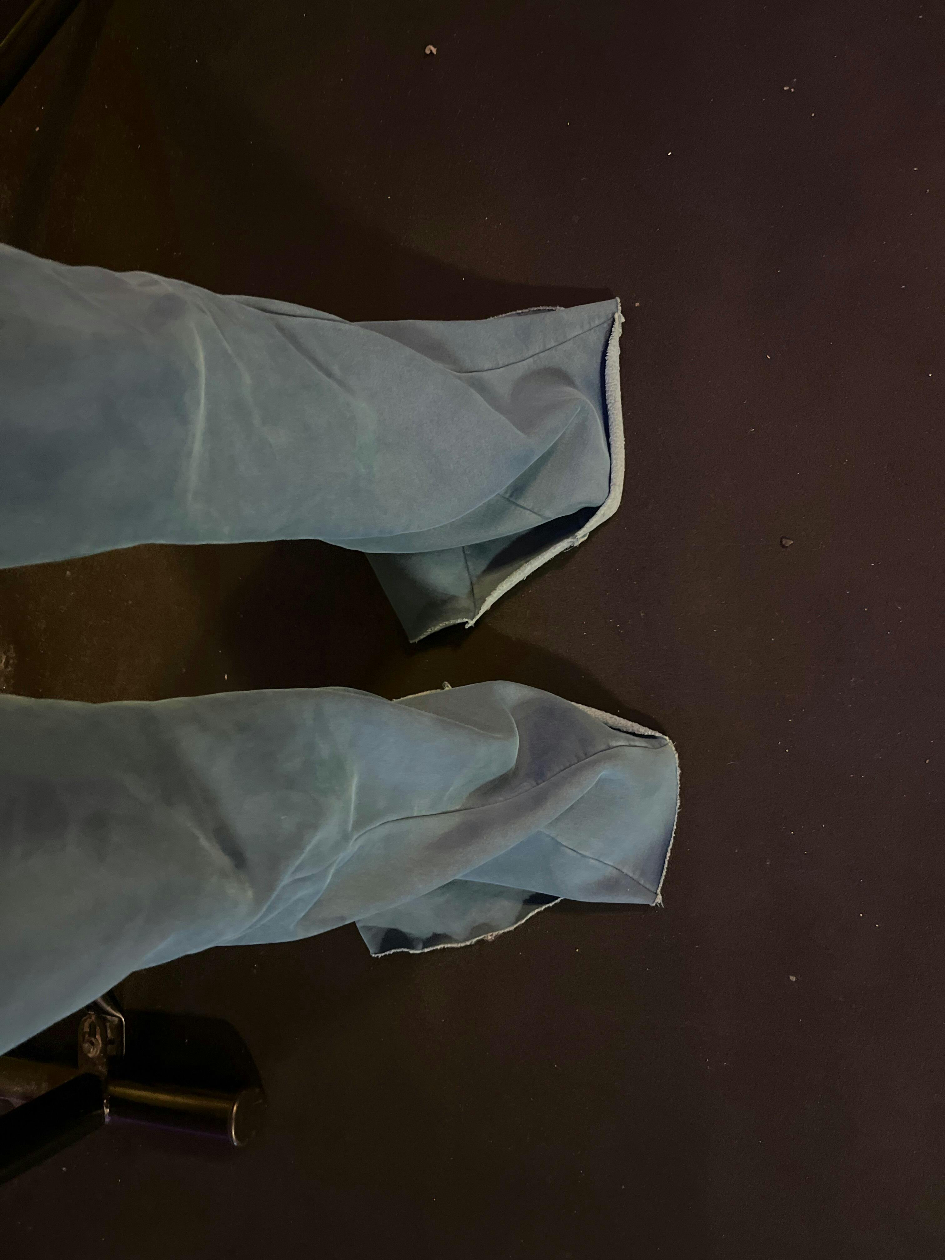 Jacket and bottom are two different shades of blue. Like the option that they came extra long for a custom length options but the two shades different makes it look like one piece was in the sun, it’s very faded